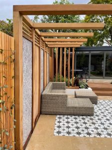 Once built we tilled the pergola with tiles from #mandarinstone. We used the Classic Casablanca Mono Decor Hexagon tiles.
