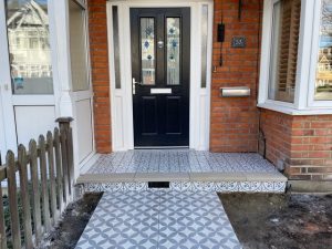 The tiles are from Mandarin Stone and are called Classic Casa Grande Décor & Tangier Bella blue. We finished the front door step with a bull nosed coping stone.
