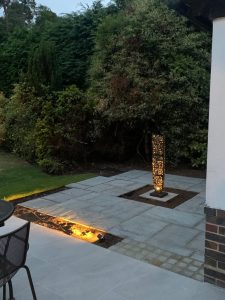 Our Client from a recently completed project in Woking, kindly sent us a picture of the water feature we built, all lit up at night-time. It looks stunning!