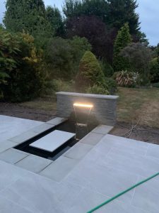 Our Client from a recently completed project in Woking, kindly sent us a picture of the water feature we built, all lit up at night-time. It looks stunning!