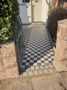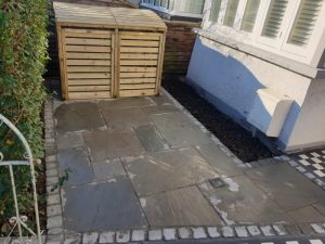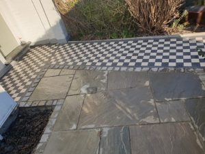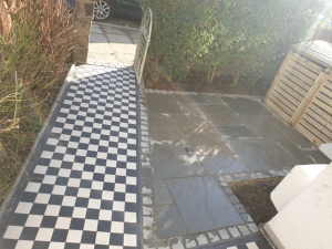 We’ve recently completed this lovely front garden patio and Victorian path. The Victorian tiles were from London Mosaic and the slabs were Indian sand stone in “Kandla grey”.