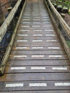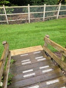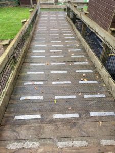 We have been working in our local area at the Virginia Water Community Centre. We firstly cleared some shrubs and then replaced any rotten timbers on the ramp. We fixed chicken wire and metal grippers to create a non slip surface.